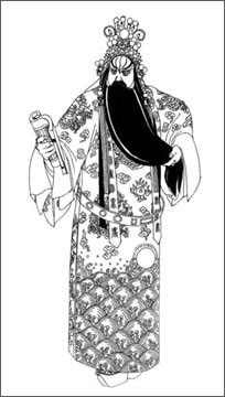 绿团龙蟒一般为红脸的忠义之士所用,如关羽、关胜、赵匡胤等。以服色之绿,与脸谱之红所形成的“补色对比”,是中国传统的配色方法,用在这里,既使服色更鲜明,又令脸色更为夺目。因为此类人物大多智勇双全,文武全材,所以在绣活上采用大方而有气派的平金绣。蟒水一般为直立水,独关羽特定用光泽度极高的全卧水套江牙,更增强人物的雄奇伟岸之感。