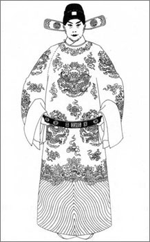 红团龙蟒应用的范围很广。团龙纹样严谨规整,装饰性强,显得文静,沉稳。在布局上呈对称形式,全身计十个龙团,以流云,八吉祥插底作陪衬。红色团龙蟒为身份高、性格文静的人物所用,如皇叔刘备、驸马陈世美、巡按王金龙等。绣活多采用绒绣或圈金绒绣,蟒水为弯立水。