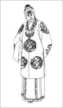 用于皇太后,明黄色,绒绣龙风团。下身系大折裙(裙边饰花纹,前后“马面”绣花也可不绣。大折裙一般为墨绿色,以示素雅沉稳)。