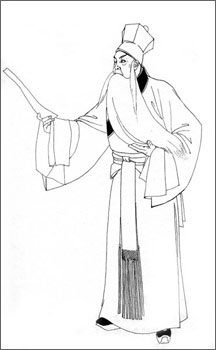 黑色缎料,黑大领。主要用于下层社会出身的英雄好汉,如秦琼、武松、石秀等。此外。这种服装也为仆人所专用,凡老院公、小院子,均穿海青,所以它也称“院子衣”(丑行扮演的院子衣服稍短)。