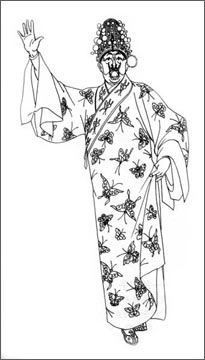 服装之用于武艺高强或性格诙谐的丑角人物。周身绒绣散点式纹样,多为飞禽(飞蝶或飞燕)。