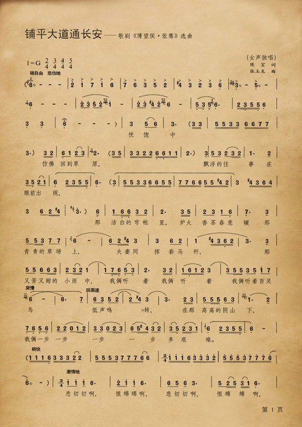 铺平大道通长安(歌剧《博望侯·张骞》选曲---女声独唱)曲谱