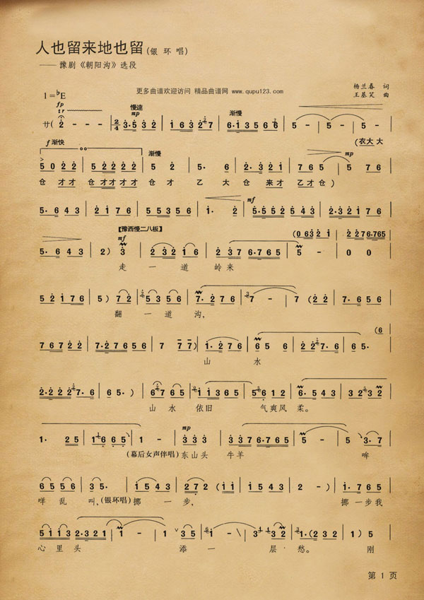 人也留来地也留(豫剧《朝阳沟》选段)曲谱